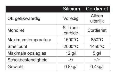 Wat zijn de technische verschillen tussen het silicium en cordieriet roetfilter? Het grootste verschil bevindt zich aan de binnenzijde, bij het monoliet. Het silicium roetfilter is volledig identiek aan die door de autofabrikanten wordt gemonteerd. Het grote voordeel van dit materiaal is de hoge temperatuurbestendigheid. Als het regeneratieproces bijvoorbeeld onverwacht wordt afgebroken, is er in het roetfilter nog sprake van een zeer hoge temperatuur. Deze kan oplopen tot boven de 1.000°C. dat is bij silicium geen enkel probleem, omdat het smeltpunt hiervan bij 2.000°C ligt. Silicium is bovendien in staat om meer dan tweemaal zoveel as op te slaan als cordieriet. In combinatie met de verhoogde weerstand tegen hoge temperaturen zorgt dit voor een langere levensduur van dit type roetfilter.